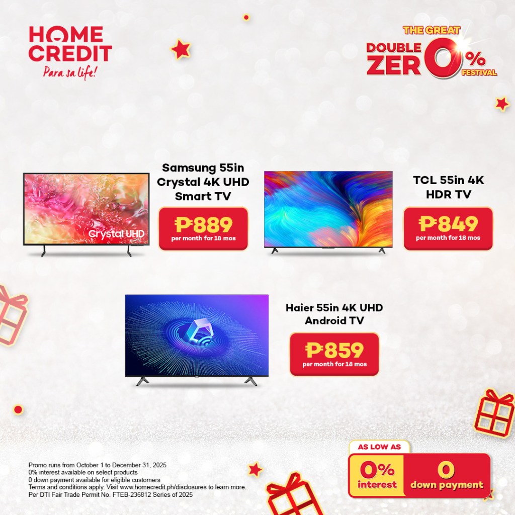 - Samsung 55” Crystal 4K UHD Smart TV – Hatagi ang pamilya og klaro ug buhi nga viewing experience uban ani nga 4K TV, as low as ₱30 kada adlaw o ₱889 kada bulan sulod sa 18 ka bulan, nga nagkantidad og ₱21,999.