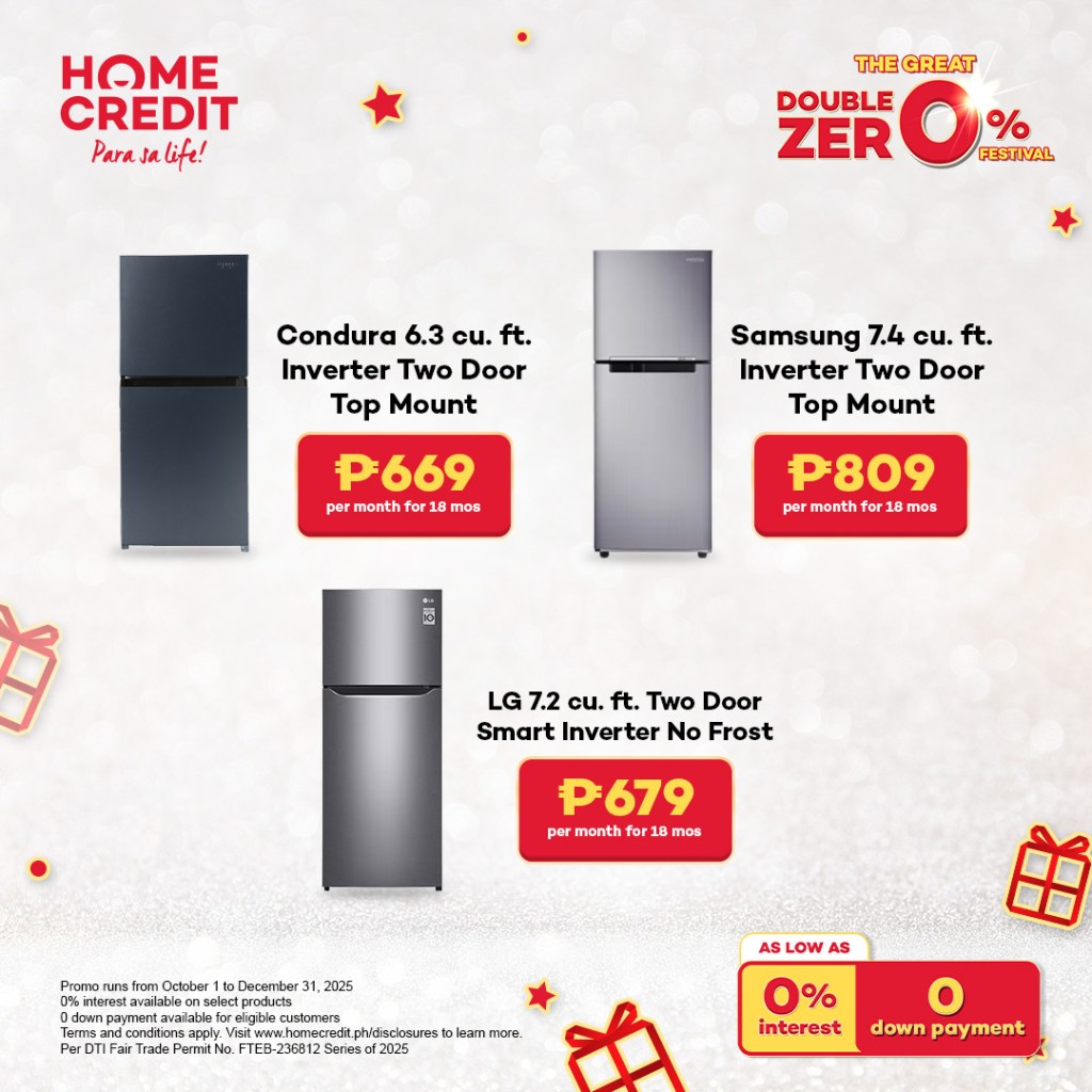 - Samsung 7.4 cu ft Inverter Two-Door Top Mount Freezer Refrigerator – Hatagi sila og mas daghang luna para sa mga handa sa holidays, as low as ₱27 kada adlaw o ₱809 kada bulan sulod sa 18 ka bulan, nga nagkantidad og ₱19,882.